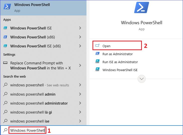 1 : Bạn vào Start > Gõ Windows PowerShell > Chọn Open .